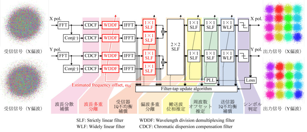 各通信システムに好適となるディジタル信号処理回路を開発し,その性能を評価しました.下図は,提案するディジタル信号処理回路の一例です.本信号処理回路は,全ての線形な信号品質低下要因に同時に対応可能です.参考のために,2モード,74波長に多重された,64Gbaud 16QAM信号の復調の様子を示しています.複数の信号品質低下要因の存在下であっても,良好な復調特性が得られることを,シミュレーション及び実験を通じて実証しました.